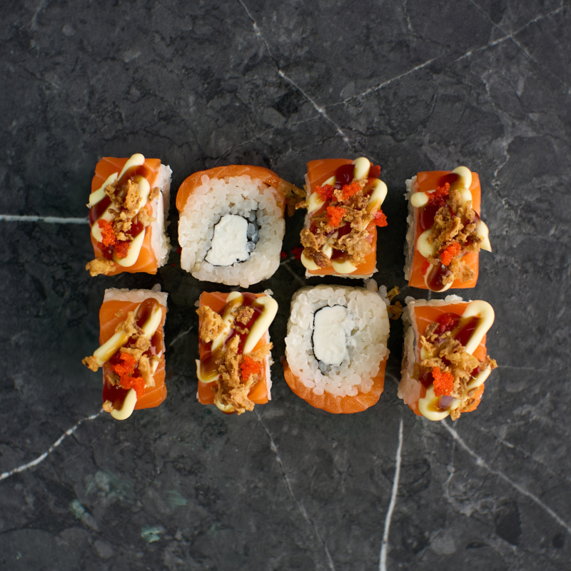 Лосось, сыр творожный, креветка тигровая, соус Майонез, соус Терияки, икра Масаго, хрустящий лук фри